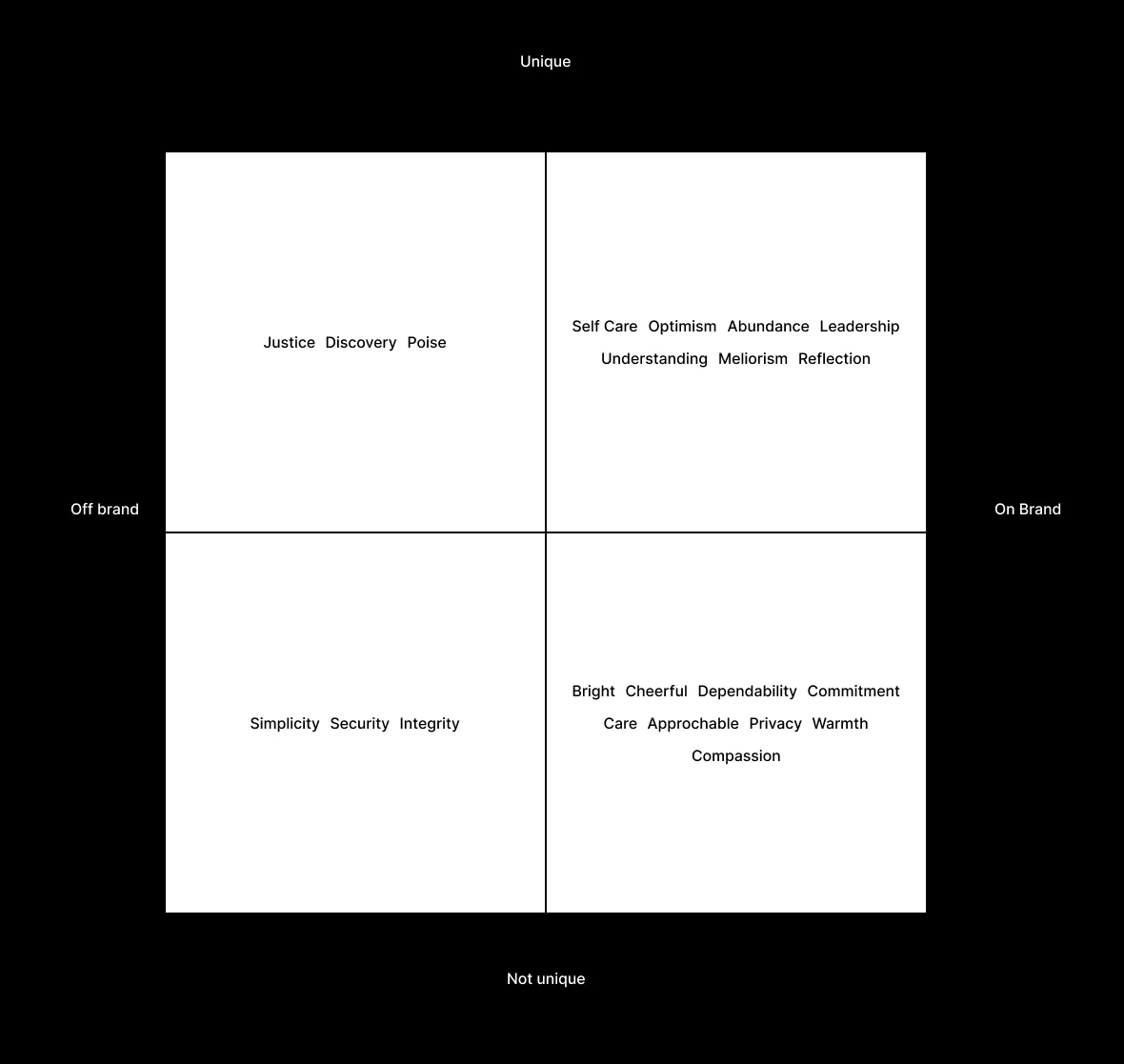 A graph depicting the brainstormed list of values being sorted into on-brand and off-brand, unique and common.