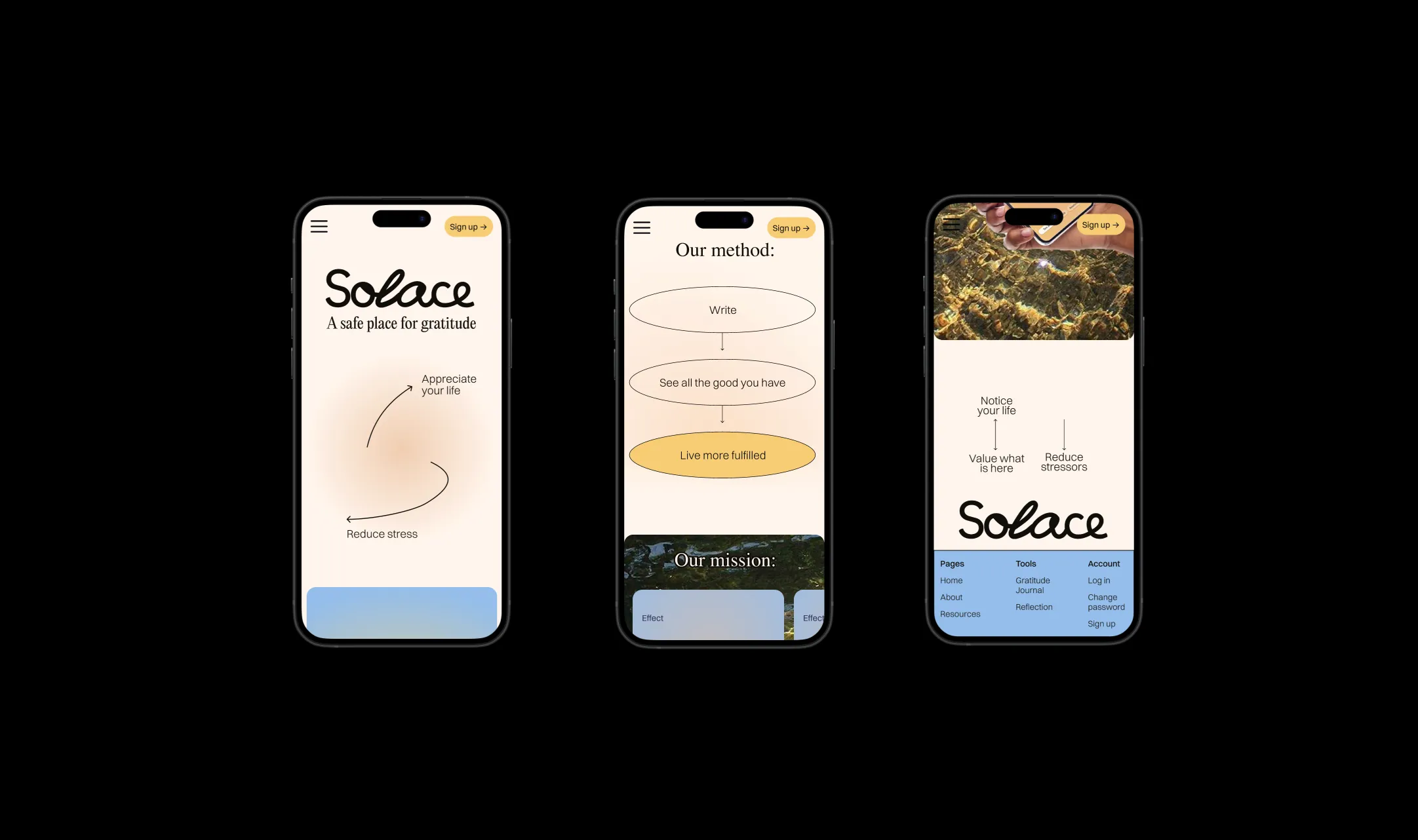 The final contenders for the name of the application. Solace won in a diverse focus group for my description of it as evoking a place, a state that can be conjured by anyone at any time.