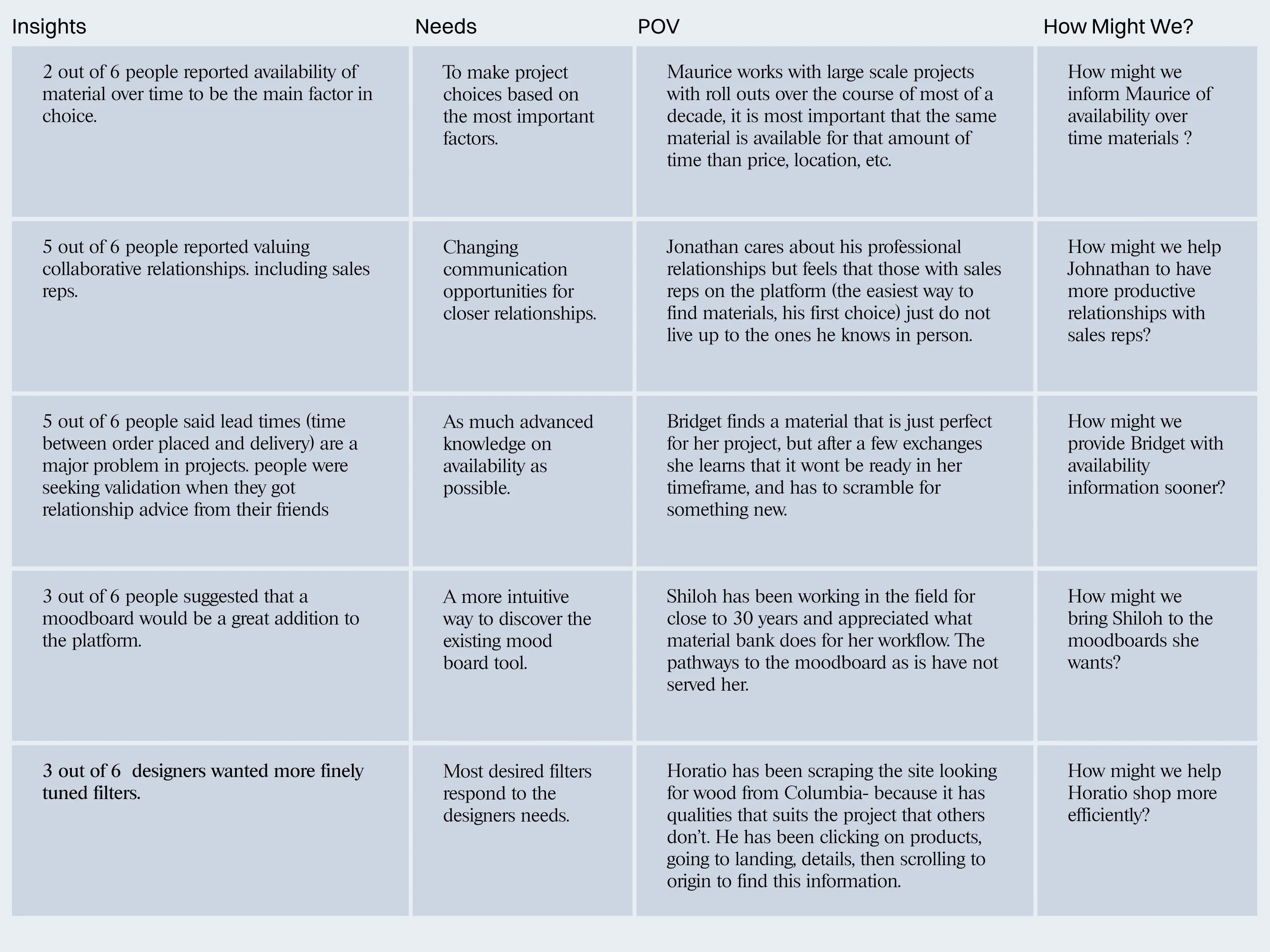 The interviews aimed to understand how people source fabric for upholstery projects. By keeping the conversations open-ended, I uncovered key limitations with Material Bank, the primary marketplace for design professionals.