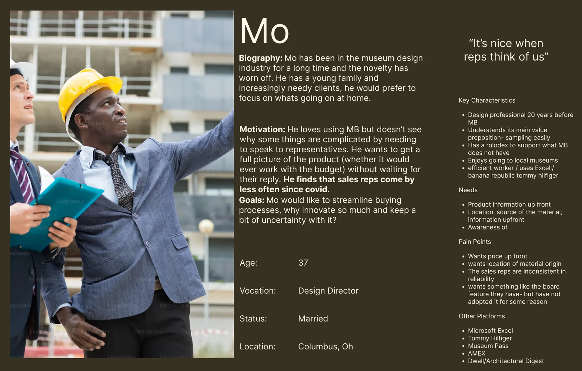 The synthesis resulted in personas of designers and reps in different parts of their careers. They are divided by the amount of time they have spent in the field and the way that filters their relationship with reps, resourcing, and collaborating.
